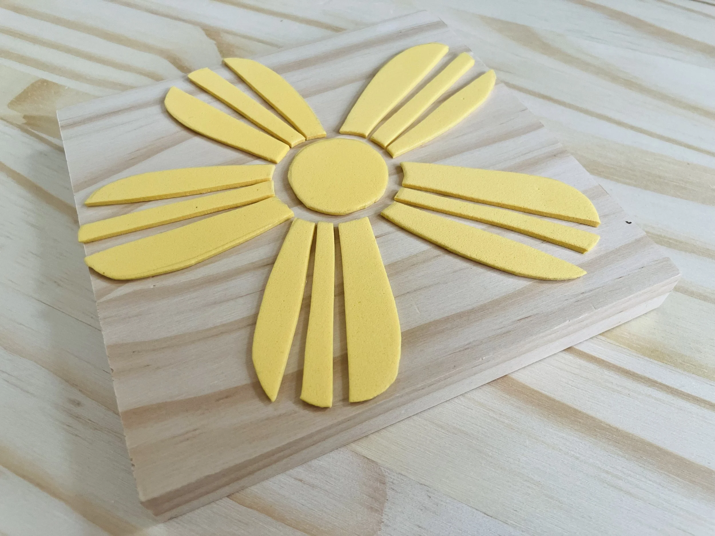 4) If using sticker backed foam, simply peel off the backing and apply to your wood, recreating your motif as you go. If using plain foam, coat the back of the foam with craft glue and apply to your wood or cardboard, recreating your motif as you go. Press the pieces down firmly and let dry completely before moving on to the next step.